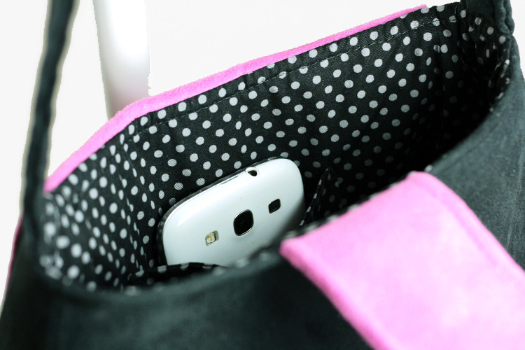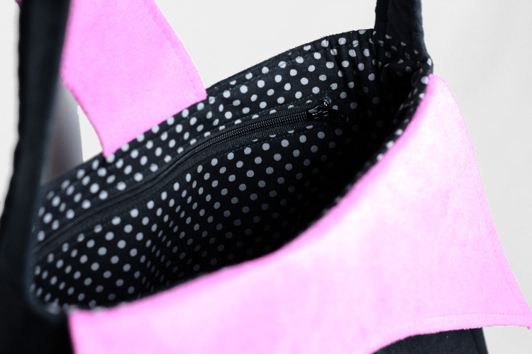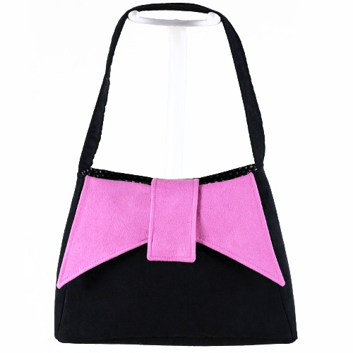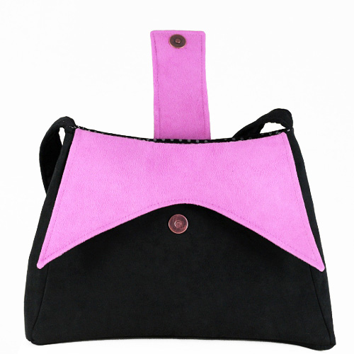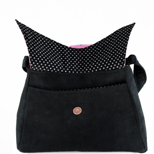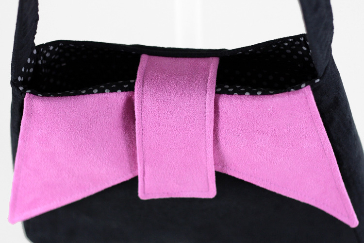 Front pocket with a bow shaped flap, kept closed by a tab with magnetic snap.