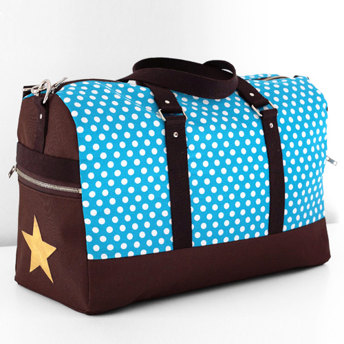 • Katia a cousu un sac weekend Boston pour son fils dans un imprimé mappemonde, simili marron et écussons - Patron Sacôtin