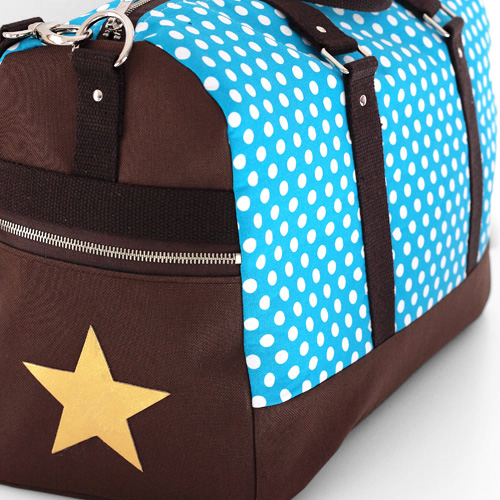 • Virgine a cousu un sac week-end Boston en simili canard, imprimé feuillages et anses avec sequins - Patron couture Sacôtin