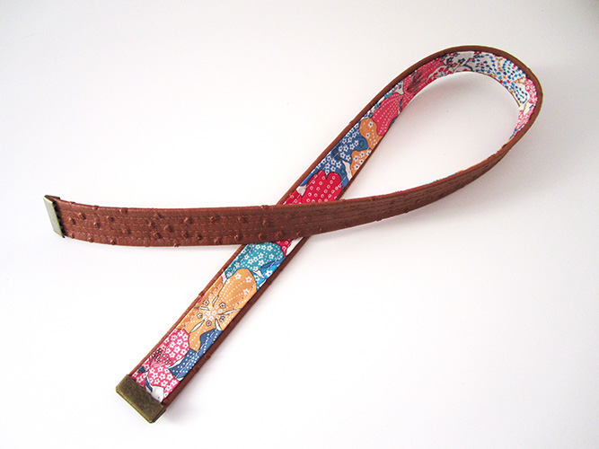 Voilà la bandoulière coton-simili est terminée : la bande contrastante est sur l’endroit et 4 lignes de surpiqûres parallèles apparaissent sur la face en simili.