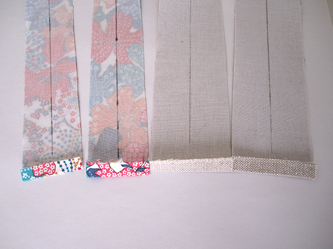2- Pour chaque bande, replier les longs bords, envers contre envers, sur la ligne centrale et presser au fer.